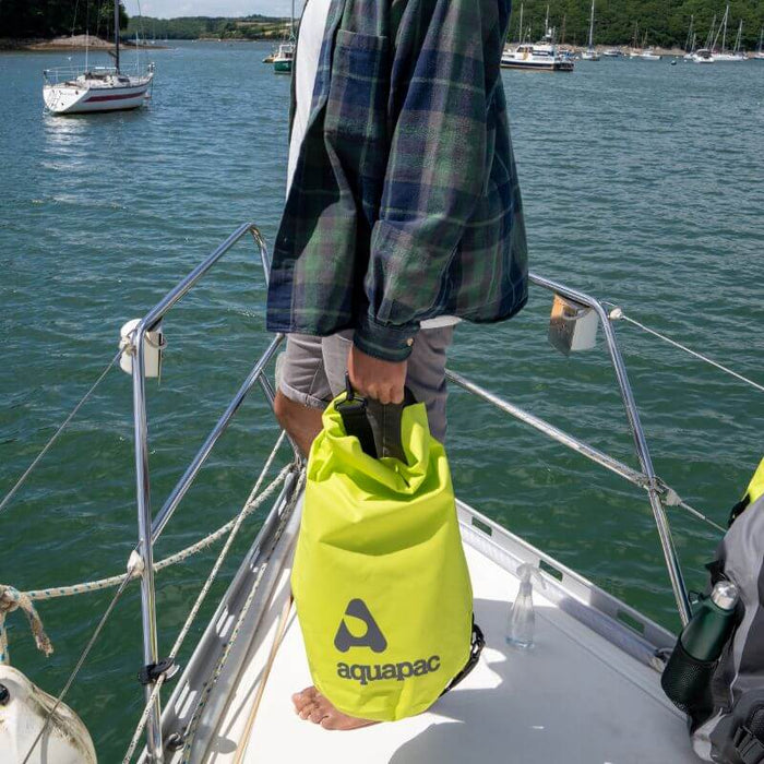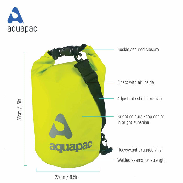 TrailProof™ waterproof, robust and functional drybags with adjustable shoulder strap for water sports, paddling, sailing, hiking or expeditions. Features: Aquapacs TrailProof™ range of drybags with shoulder strap. with roll-up closure system.These are tough and simple drybags which allow you to pack and go, wherever you need to go Of course waterproof to IPX 6 The drybag in your chosen size : 7 liters, 15 liters, 25 liters or 70 liters In two colours: acid-green or cyan-blue For travel, rafting, camping, sailing, expeditions and outdoor tours lightweight: 243g; 375g; 457g or 776g They are made from tough 500D vinyl to withstand all the knocks that you experience on the trail or on the boat flat bottom It is really simple to seal these drybags, just roll the top down 3 times. The bright colour in acid green or cyan blue means you can easily spot your gear amongst everyone else's, and it reduces how hot they'll get if left out in the sun.Content not included in the delivery. Details: In 4 sizes: 7 liters, 15 liters, 25 liters or 70 liters with shoulder strap and roll seal system lightweight: 243g; 375g; 457g; 776g Made of 500D Reinforced Vinyl The Sizes (rollseal closed): TrailProof™ Drybag 7 Liters TrailProof™ Drybag 15 Liters TrailProof™ Drybag 25 Liters TrailProof™ Drybag 70 Liters What stops the water getting in? The TrailProof™ waterproof drybags uses a simple and well-proven roll-seal closure. You can roll it over as many times as you like but we reckon 3 times is all you need to give you a 100% waterproof seal. What keeps the water out? Roll up the upper end of the bag three times and close the buckle. Now, no rain or spray comes in.In action: You can store a lot of luggage in this waterproof bag. When you are traveling, for example go on board, when rafting, camping or on expedition. And when it rains or it gets rougher: No water will come into the bag. In the evening you still have dry clothes when it comes to eat or you let the day end comfortably. Wherever. Around the campfire.